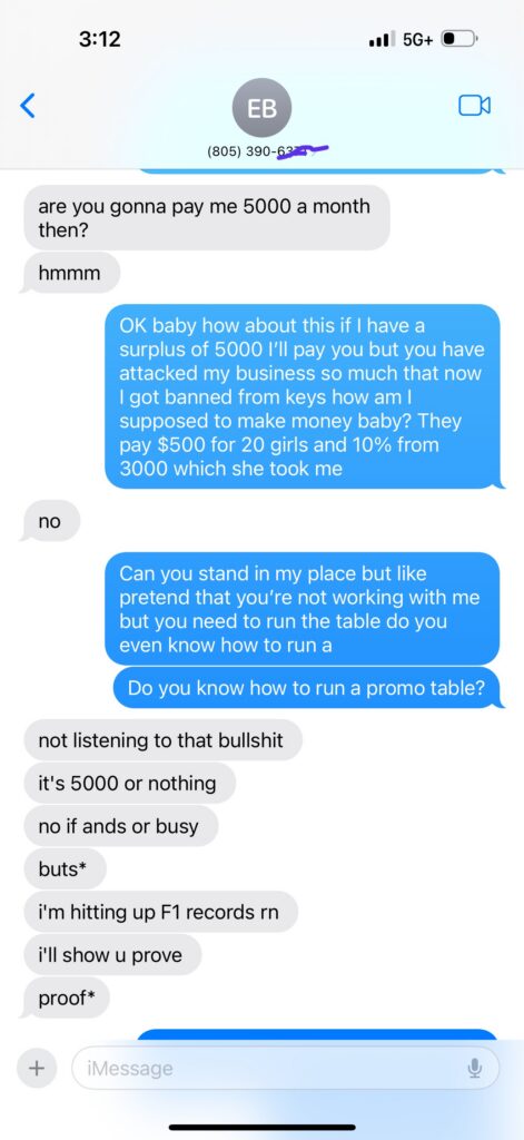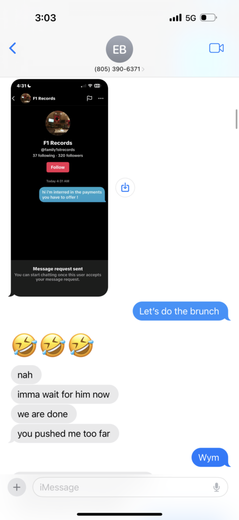 Months five and six ramped it up. Unhappiness with the flow led to direct statements about making things difficult, proposals for regular meets at fixed amounts – “350 for the session” or similar. Threats to connect elsewhere appeared often: “If this doesn’t work, I’ll go with someone who can.” Direct outreach to music contacts showed up, like messages to F1 Records about payment options. Verbal rates got thrown around – five thousand for starting points, ten thousand for fuller engagements, or specific figures for acts like that. It was clear: the “relationship” was now a tool to secure the flow, with gifts from “evil men” or rich contacts as the alternative if the main one faltered.
