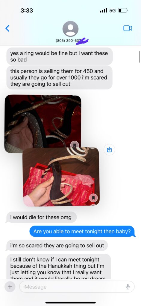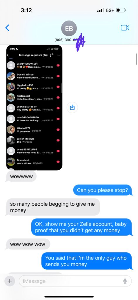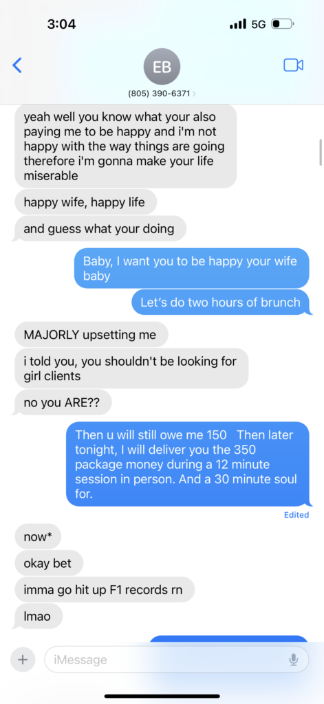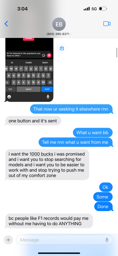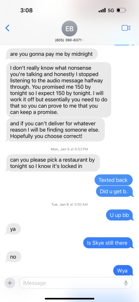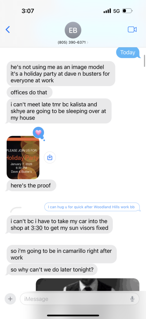 By months three and four, the shift happened. Communications turned to specific expectations for money by deadlines, phrased as ways to show commitment. “I need this by tonight to keep us solid,” she’d push, with follow-ups about what would happen if it didn’t come through – mentions of finding other support, other connections in the industry. Plans for multi-day trips to places like New York came up, framed as opportunities but tied to financial backing. She’d tell her family she was out with Shkye, maintaining the cover while the real arrangements played out.
